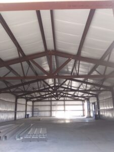 Next, we moved on to discuss any options that our customer needed for their building. To stay on task and meet our budget, we stuck with only the essential options. We added a 3” insulation package to the roof and walls of the building to help with temperature regulation. The insulation should stop any of their materials from freezing or melting throughout the year. We also added gutters & downspouts to both sides. This helps push water away from the building to avoid any flooding or water seeping through the bottom of the building.