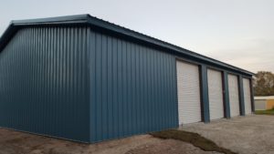 Now that we had the overall functionality and door layout finalized, it was time to work on the aesthetics.  Because this will be a service shop business, our client wanted to spruce the building up a bit while staying within their budget. They still wanted to keep it basic, but appealing.  We added 18” roof overhangs with soffit all the way around and went with a Cobalt Blue color selection on the walls and trim.  These options really gave the building a standout look.