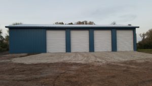 Staying within budget was our primary concern while finding a way to fit 4 large door openings and still have a section of the building dedicated to storage and open space.  Our patented red-iron steel truss frame was the perfect solution to minimize costs while maintaining design integrity.  Because this was an RV repair shop, the depth of the metal garage needed to be 50’ deep.  80’ of length was the maximum the budget allowed for so we had to make use of this 4,000 square foot space as best we could.  RVs typically require a 12’ wide by 14’ tall garage door for access.  We needed to fit 4 of these doors on the same sidewall while also allowing a good-sized section off to one end of the building that could store materials and have some open space.  The location also has a higher-than-normal wind load requirement of 130 mph.  To help with both items, we added an extra truss.  This gave the building more strength and allowed us to adjust the door opening layout the way we needed it.