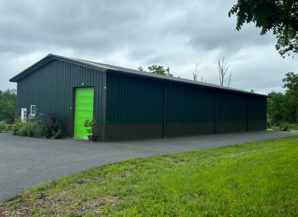 Your choice of color for roof, wall, trim, and wainscot from Color Chart. All structural members are high strength 57,000 psi steel, cut to length, and pre-punched for easy assembly with either 1/2″ bolts or self-drilling screws. Roof and Wall panels are 26ga. 80,000 psi painted galvanized steel.